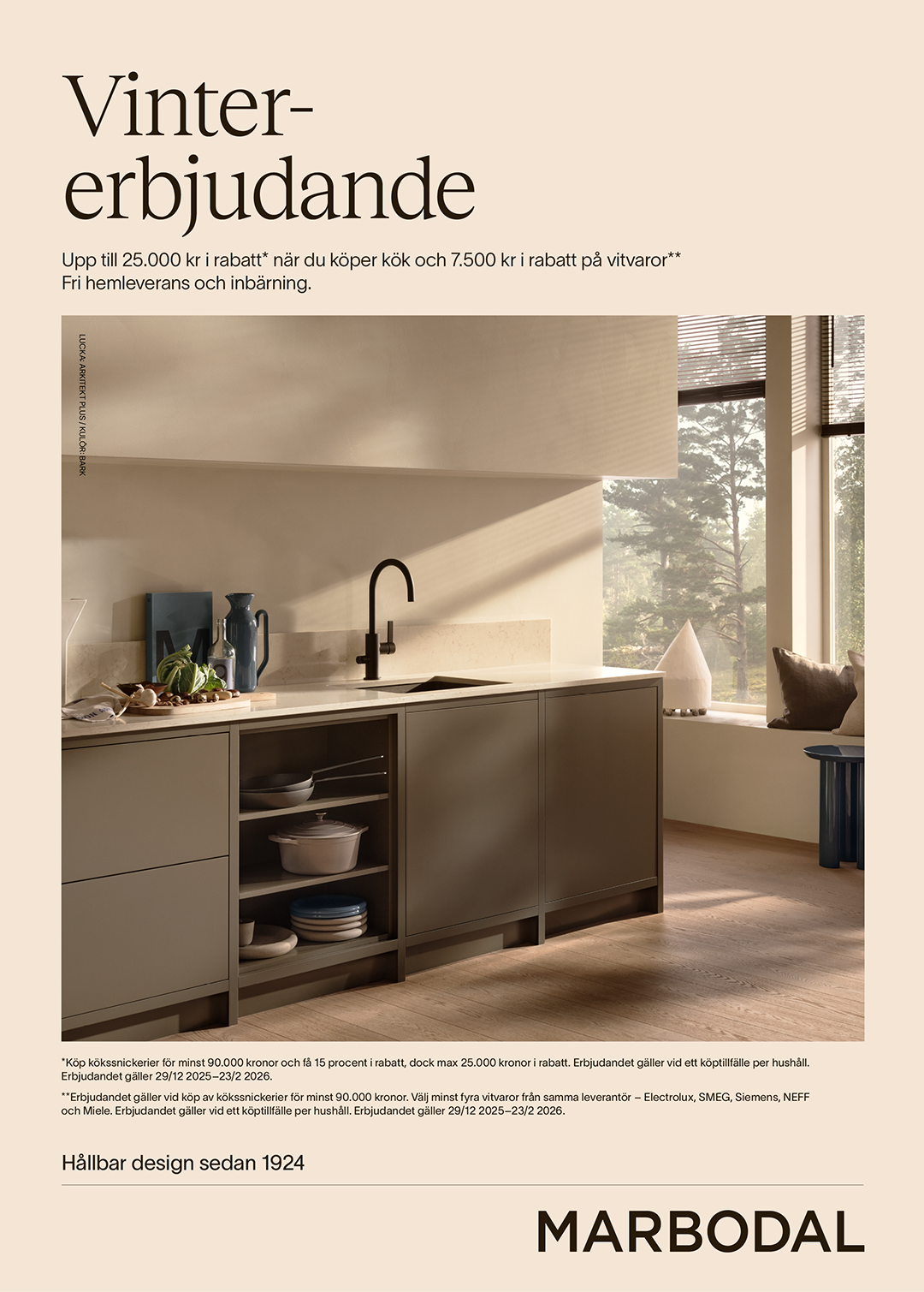 ** Erbjudandet gäller vid köp av kökssnickerier för minst 90.000 kr. Välj minst fyra vitvaror från samma leverantör – Electrolux, SMEG, Siemens, NEFF och Miele. Erbjudandet gäller vid ett köptillfälle per hushåll.