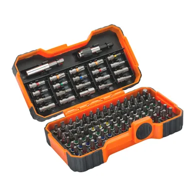 1/4" sexkantsfäste DIN 3126 och ISO 1173, typ C 6.3. För spår-, Phillips®-, Pozidriv-, insex-, Torx®-, Torx®TR-skruv med centrumspets och Robertsonskruv. Innehåller 100 delar: 97 bits, en magnetisk bitshållare KM653, en bitshållare med magnetisk snabblossning KM653-QR och en hylsadapter 1/4". 25 mm:. Spårbits: 4,5 mm, 5,5 mm. Phillips-bits: PH1x2, PH2x9, PH3, PH2Gx5. Pozidriv-bits: PZ1x2, PZ2x9, PZ3. Torx®-bits: T10 x3, T15 x5, T20 x15, T25 x8, T27, T30 x15, T40 x3. Torx®-bits med centrumspets: TR10, TR15, TR20, TR25, TR30. Insexbits: Insex 3 mm, 3st. 4 mm, 5 mm, 3 st. 6 mm, 8 mm. Robertson-bits: nr 1, nr 2. För universalbruk. Högkvalitativ stållegering. Sandblästrad med rostskyddsolja. 1/4" fyrkantsadapter av kultyp för hylsskruvmejsel av standardmodell (typ C 6.3). Universalbitshållare med kraftig magnet (typ E 6.3). Magnetisk bitshållare med snabblossningsfunktion och låssystem (typ E 6.3). Robusta och kraftiga bits. Torx®-bits är färgkodade för enkel identifiering. Asken är rejäl och skyddar bitsen ordentligt