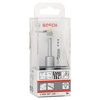 Easy Dry diamantborr gör det enkelt att torrborra i keramiska material. Den inbyggda kylmedelsbehållaren ger borren jämn prestanda, och dess robusta och slitstarka vakuumlödade diamanter gör arbetet enklare. Arbetslängden på 33 mm gör det dessutom bekvämt att borra hål i kakel och klinker av alla tjocklekar. Denna produkt är avsedd för olika material, från mjukt kakel till mycket hård klinker samt fint stengods. Borra inte i slagläge. Passar till sladdfria skruvdragare och borrar med 13 mm chuck.