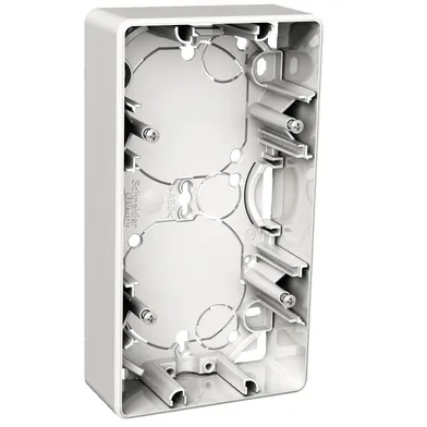 IP21 då kabeln förs in underifrån eller från sidan, med undantag för 2-vägsuttaget som är IP20. Nyckelhål för montage över apparatdosa c/c 60 mm. Utbrytningar i bottendel. Möjligheter till att montera dragavlastning och skiljevägg. Separat bottendel och förhöjningsram förenklar installationen. Kompletteras med valfri Exxact-ram.