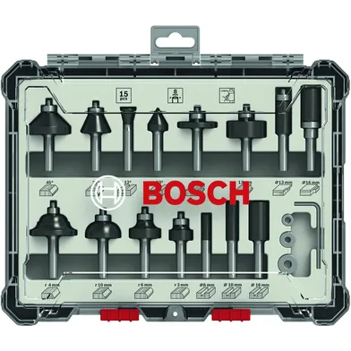 Frässtålsatsen ger fina snitt för en mängd olika tillämpningar och är därför ett utmärkt val för träarbetare som finsnickare, grovsnickare, interiörmontörer och byggnadsarbetare. Frässtålens skäregg av hårdmetall ger lång livslängd, och fräsning av en rad olika profiler i många olika material är möjlig tack vare de olika skärningsgeometrierna. De är också tillverkade enligt säkerhetsstandarderna i DIN EN-847. Frässtålen är avsedda för användning på mjukt och hårt trä och träkomposit. Frässtålsatsen har lättåtkomliga fack som gör att stålen kan plockas upp snabbt och säkert med skaftet. Förvaringslådan är exklusiv och stadig och håller stålen säkert på plats för utmärkt skydd av innehållet under förvaring och transport. Locket är genomskinligt fönster så att man kan se innehållet. Den blandade frässtålsatsen med 15 delar är en omfattande startsats med klassiska frässtål och extra delar såsom en insexnyckel och tre kullager. Satsen finns i tre olika uppsättningar, 6 mm, 8 mm eller ¼-tums skaftdiameter, som täcker kompatibilitet med alla vanliga handöverfräsar.