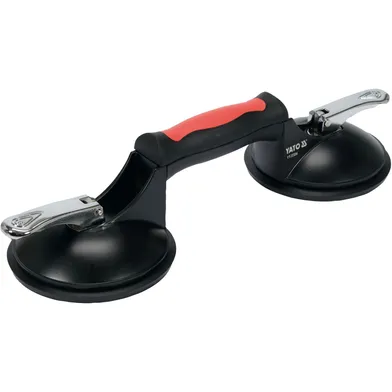 Glaslyft/sugkopp Dubbel. Gummisugkopp dubbel (2x125 mm). Tvåkomponentshandtag och kropp av gjuten aluminium. Till glas, metall, plast, dörrar, fönster, skivmaterial m m med släta ytor. Zinklegerade låsbeslag. Levereras i kartong. Storlek: 245x125x7 mm Lyfter max 120 kg horisontalt (handtaget rakt upp) och 60 kg vertikalt (handtaget vertikalt)