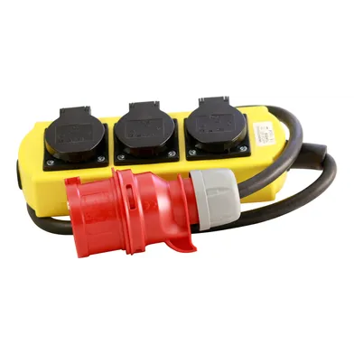 Grenuttag tillverkad i slagtålig polyamid. Monterat med 1 m 5G2,5. Uttagen har självstängande lock. Monterad med stickpropp anslutningsdon 16 A/400 V. Godkänd för utomhusbruk. Lämplig för industri, verkstad, och byggarbetsplatser.