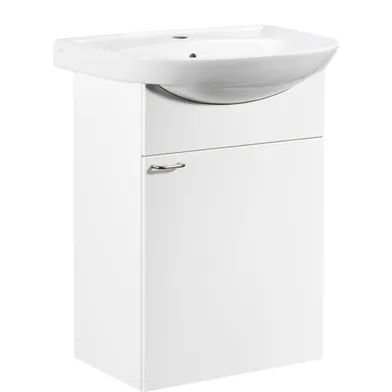 Basic Kompaktlaminat underskåp med Basic tvättställ i porslin. Underskåp för upphängning på vägg, kan monteras höger- eller vänsterhängt. Skåpet har en lös hylla. Tillverkat i fukttrögt material. Tvättställ i porslin för konsolmontage. Konsoler, blandare och vattenlås beställs separat. Levereras färdigmonterade.