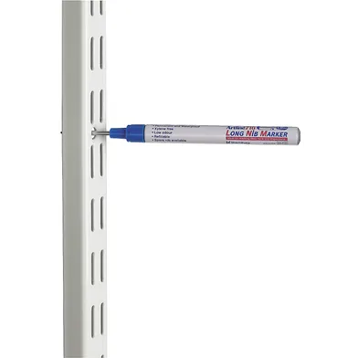 Märkpenna med 30 mm långt metallrör med en 2,8 mm rund fiberspets. Ytterligare 10 mm infästning av metallspetsen, gör det möjligt att märka i svårtillgängliga hål upp till 40 mm. Idealisk vid märkning av t ex borrhål för uppsättning av skenor eller konsoler. Alkoholbaserat svart eller blått bläck som är permanent och vattenfast. Fäster på dom flesta underlag. Pennkropp av aluminium och lång skyddande pennhuv med möjlighet att fästa halsrem. Gradering upp till 70 mm finns på hylsan – praktiskt för snabbedömning av t ex plugg och skruvlängd.