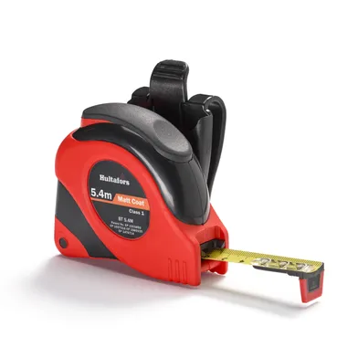 Gult stålmätband graderat med mycket exakt bläckstråleteknik och matt yta för reflexfri avläsning. Ändbeslag av gummi monterat med spel för invändig och utvändig mätning, dämpande bandretur skyddar ändhaken mot skador.