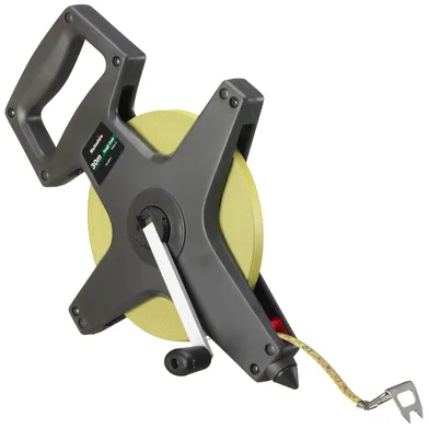 Gult stryktåligt stålmätband, bandbredd 10 mm, graderat med mycket exakt bläckstråleteknik, har dessutom en tjock nylonmantel för att bli extra tåligt*, med ram av ABS-plast. Du kan välja mellan bandbörjan typ A eller C.