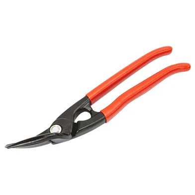 Höger- och rakklippande plåtsax. Klippkapacitet: 0,6 mm (rostfritt stål), 1,2 mm (kallvalsat stål). Huvudets utformning gör det möjligt att klippa med både hand och verktyg placerade ovanför arbetsstycket. Bekväma plastöverdragna handtag med bra grepp. Smidd av specialstål. Räfflade och slipade blad. Tandat övre skär minskar risken att den glider över hårda material. Plåtsax för rak- och vänsterklippning och genomgående klippning. För medelhårda till hårda material