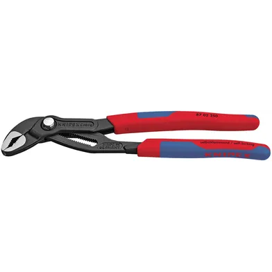 Serie Comfort Line. Typ Cobra. Med snabbinställning. Kraftigt utförande i kromvanadinstål. Räfflade alligatorkäftar med patenterat rörgrepp. Självlåsande - när tången klämts fast runt ett föremål, låser den fast sig. Försedda med klämskydd. Delad glidled. Breda ergonomiska handtag av tvåkomponentsmaterial.