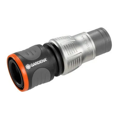 Slangkoppling i metall som säkrar snabb och bekväm slangkoppling. Modern tilltalande design, räfflade grepp av mjukplast, hög slanghållkraft genom stabil spännmutter av högkvalitetsmetall, med inbyggt veckningsskydd. Den kraftiga spännmuttern med förlängd slangguide försäkrar en hög greppstyrka, medan det integrerade knäckskyddet hindrar slangen från att glida ut.