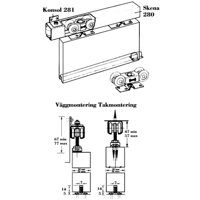 Skenan fästes antingen i vägg eller tak. Alternativa styrningar kan erhållas. t.ex. med styrrulle i golvskena. Data för dörr: Maxhöjd 2400 mm. tjocklek 20-50 mm. maxvikt 50 resp. 100 kg. Väggkonsol 281: Vinkeljärn som används vid väggmontering av skjutdörrskenan. Vid beställning: Skena och beslagssats beställes separat. Golvstyrning 102N ingår som standard. Beslagsats H50 innehåller: 2 hängrullar. dörrledare. dörrstoppar. skruv och monteringsanvisning. Beslagssats H100 innehåller: 2 kullagrade hängrullar. dörruppställare. dörrledare. dörrstoppar. skruv och monteringsanvisning.