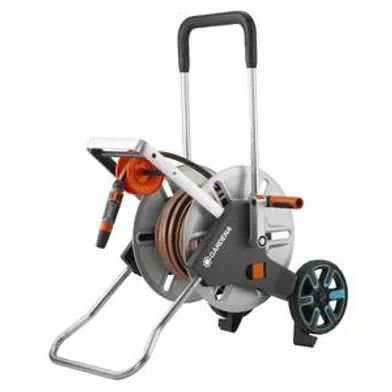 Slangen kan rullas upp med hjälp av den ergonomiska metallveven med mjuka plastkomponenter och den stadiga slangstyrningen. Tack vare den vikbara foten kan den inte längre tippa. Även dess speciella form och synligt höga placering av hjulen stöttar slangvagnens stabilitet. För utrymmesbesparande förvaring viks foten enkelt ner, handtaget sänks ner och veven fälls in. CleverRoll M Easy Metal-paketet är klart att användas och inkluderar 25 m Comfort FLEX-slang 13 mm med Gardenas originalsystemdelar och sprutmunstycke. 18547-20