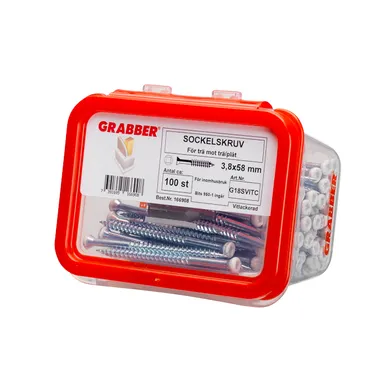 Användningsområde. Skruv avsedd för montering av socklar, även lämplig att fästa trä mot plåt med godstjocklek 0,46-1,0 mm. Inomhusskruv. Beskrivning. Skruven är tillverkad av härdat kolstål med vass spets och litet huvud. Fyrkantsgrepp. Fingänga. Blankförzinkad ytbehandling med vitlackerat huvud. Korrosivitetsklass C1. Montering. Skruvdragare. Rekommenderat varvtal: 400-1200 varv/min.