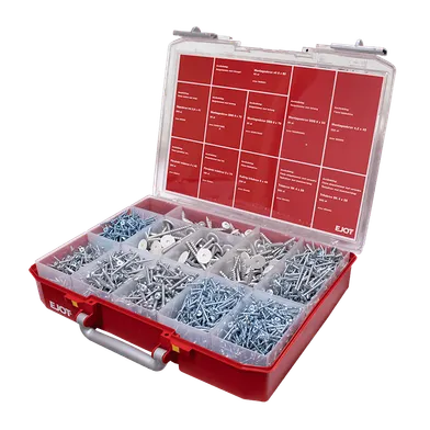 Anpassad sortimentlåda fylld med infästning för att montera skåp, bänkskivor, socklar med mera. Allt för köksmontage.