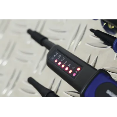 2-polig spänningsprovare, lik- och växelspänning från 6 till 400V. Instrumentet har en klare LED-indikation på relevanta spänningar och automatisk polaritetsvisning. Testproberna har både 2 och 4 mm diameter testspetsar, vilket säkerställer god kontakt i alla typer av uttag.