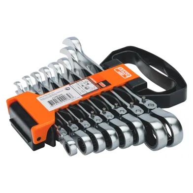 Satsen innehåller åtta delar: 8, 10, 11, 12, 13, 14, 17 och 19 mm. Käftvinkel 15°, tunn för bättre åtkomlighet. 5 ° omtagsvinkel. Ledat spärrhuvud i 180° med fasta steg efter var 15:e grad. Med hållare av plast. Ringände med 12-kants Dynamic-Drive™-profil som ger skruvar och muttrar längre livslängd. Mattförkromad yta med hög kvalitet. Högkvalitativ stållegering. Enligt: ISO 3318 och DIN 311