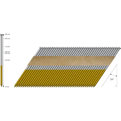 Art. nr | Art. namn. Stomspik 34° Kammad FZV rakbandad 3,1x90 mm, 500 st/frp | Antal per förpackning 500 | Längd 90 mm | Diameter 3.1 mm | |