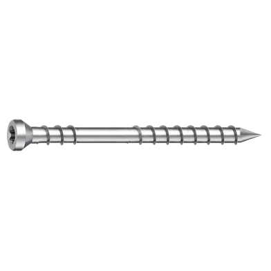 Trallskruv i rostfritt stål A4 för dold infästning i trall. Skruvens spets minimerar sprickbildning vid montering. Skruvens huvud är utformat för att ge ett så minimalt synligt montage som möjligt.