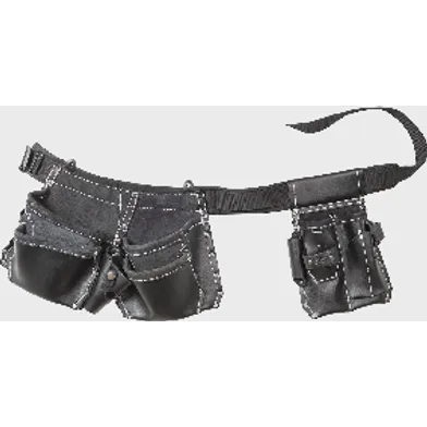 4 fickor för spik och skruv m.m, 6 fack för verktyg. Hammarhållare i svart läder. Knivhållare, hållare för märksnöre. Nitförstärkt med metallspänne. 60 mm bred polstrad mjukrem. Fickorna bärs på höften, en funktion som är i särklass. Vattenavvisande läder i mycket hög kvalitet som håller sig mjukt även vid kyla och med mjuk specialbehandlad insida.