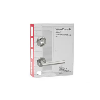 Komplett ytterdörrsats av aluminium, med dörrhandtag Miami. Dubbelverkande returfjäder. Perfekt för bodar, fritidshus, garage etc. Levereras med cylinder inklusive 3 st nycklar, cylindervred, cylinderring Universal och skruvar. Passar dörrtjocklek 30-80 mm.
