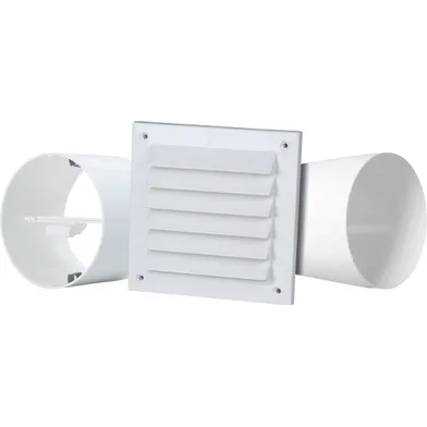 Ytterväggskit Intellivent YVG D100 Teleskopisk. Komplett genomföringspaket för yttervägg. Innehåller kallrasskydd, ytterväggsgaller samt ett teleskopiskt väggrör med stos. För anslutning till fläktar med stos Ø98-100 mm. Passar väggtjocklek upp till 300 mm.
